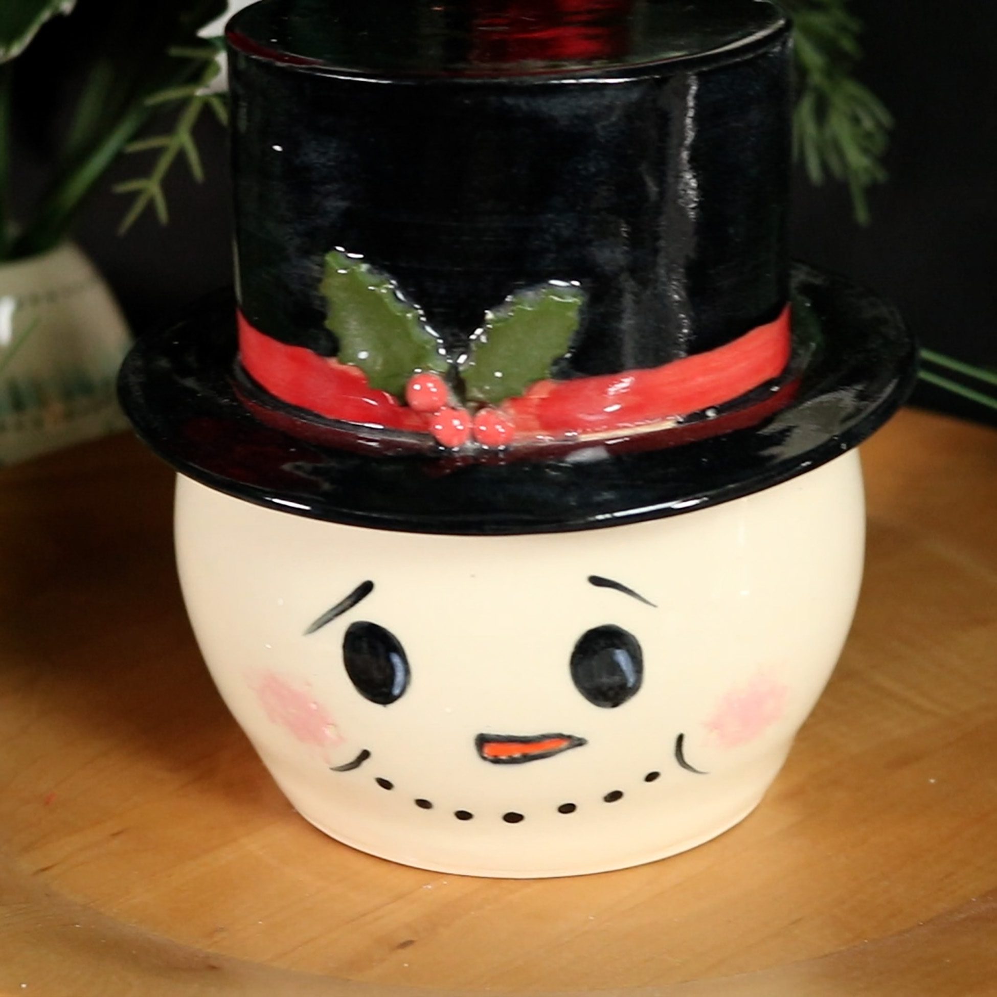 This snowman jar will bring winter cheer to your kitchen counter. The dimensions are 5.5″ in diameter and 5.5″ high.