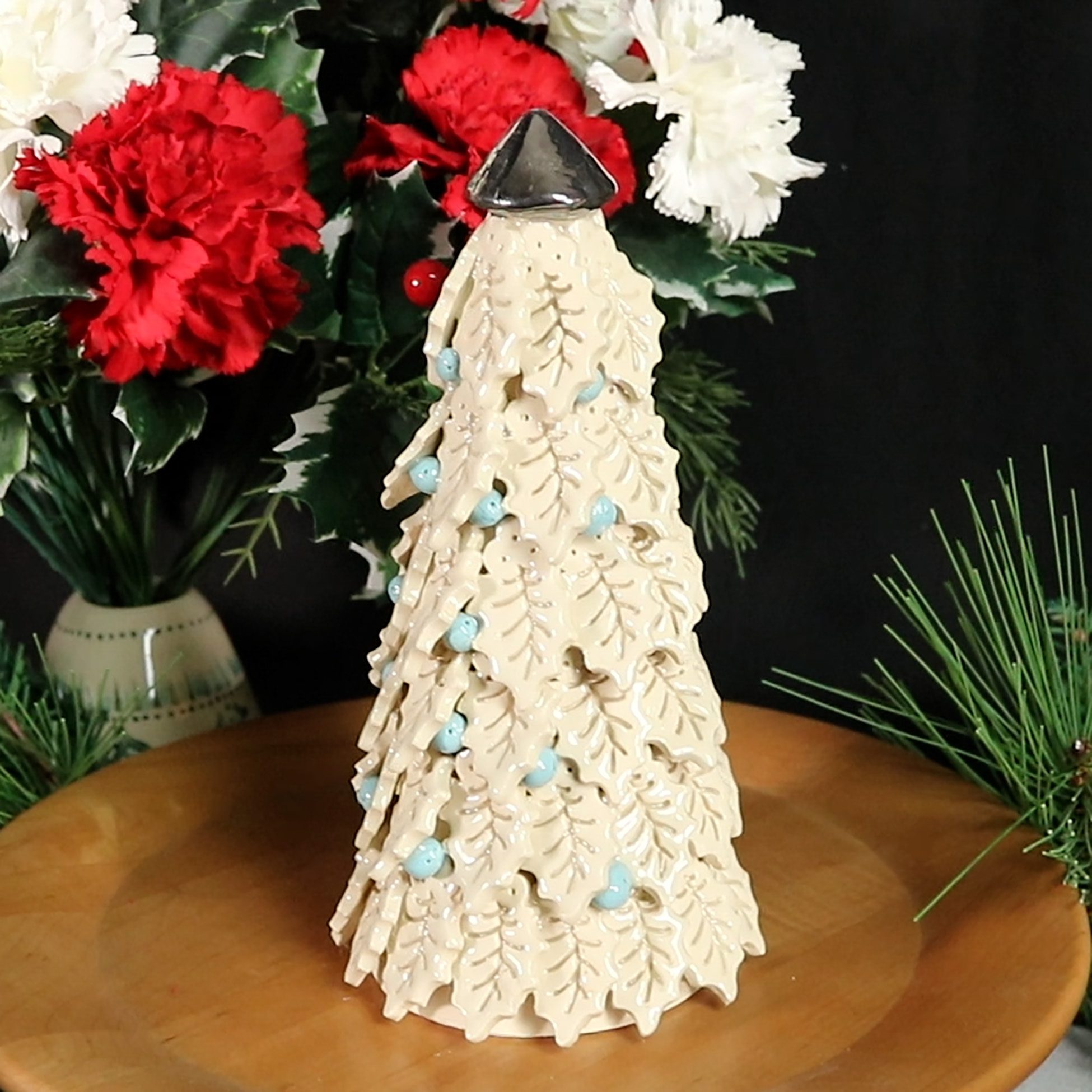 This tree adds a touch of elegance to any holiday decor. The dimensions are 3.5″ base and 8.5″ tall.